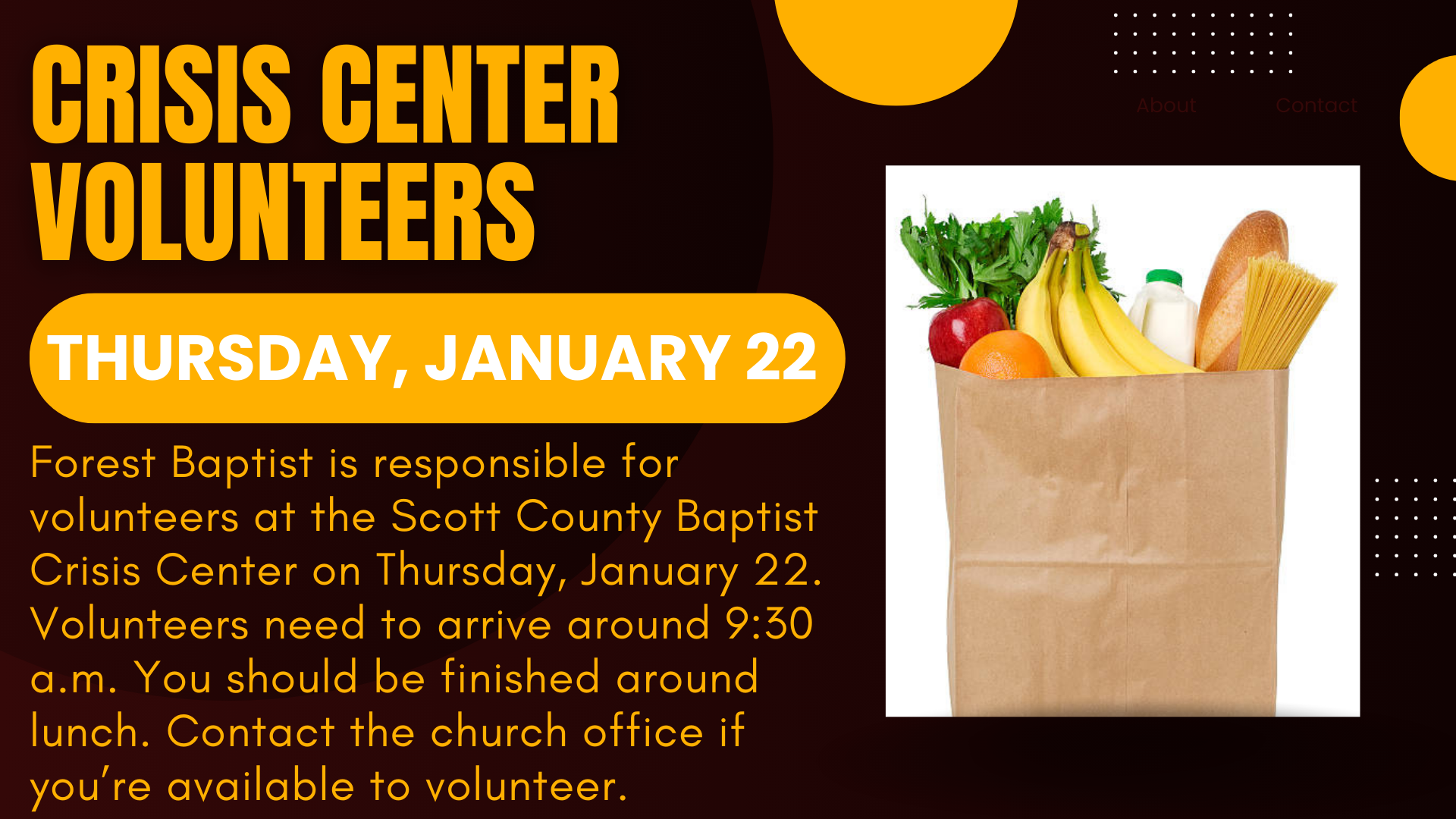 Forest Baptist is responsible for volunteers at the Scott County Baptist Crisis Center on Thursday, January 22. Volunteers need to arrive around 9:30 a.m. You should be finished around lunch. Click here if you will be able to help!
