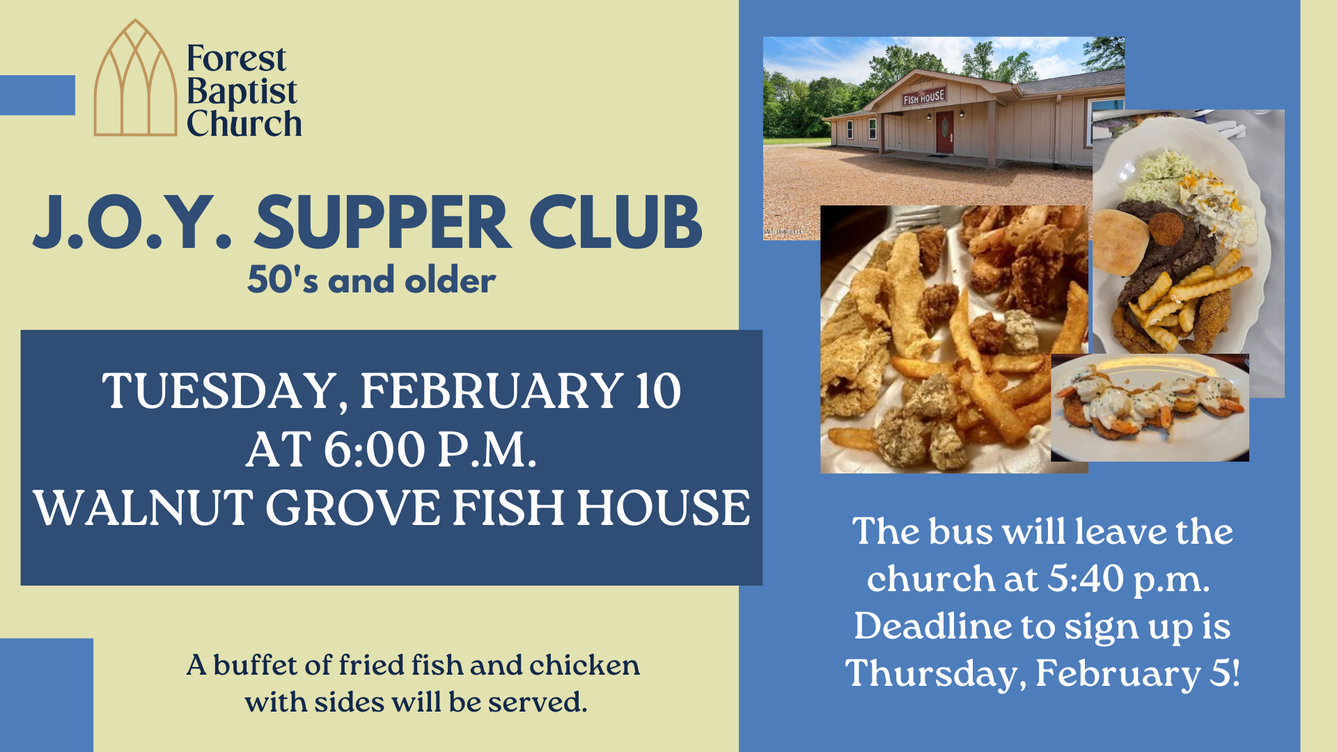 J.O.Y. Supper Club will be going to the Walnut Grove Fish House on Tuesday, February 10 at 6:00 p.m. A buffet of fried fish and chicken with sides will be served. The bus will leave the church at 5:40 p.m. Deadline to sign up is Thursday, February 5. Sign up here if you plan on going!