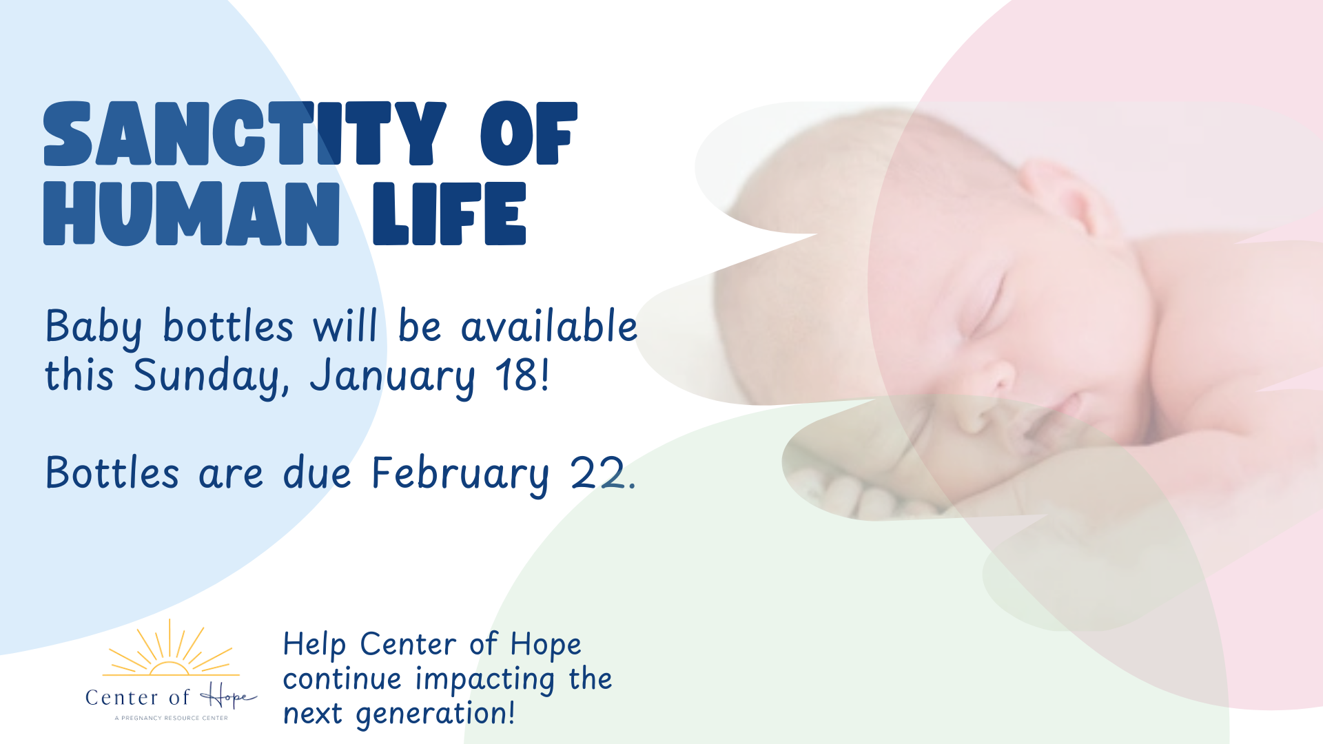 Baby bottles will be available in the Welcome Center and the Foyer this Sunday, January 18! Pick up a bottle and fill it with change, bills or a check. Bottles are due on Sunday, February 22.
