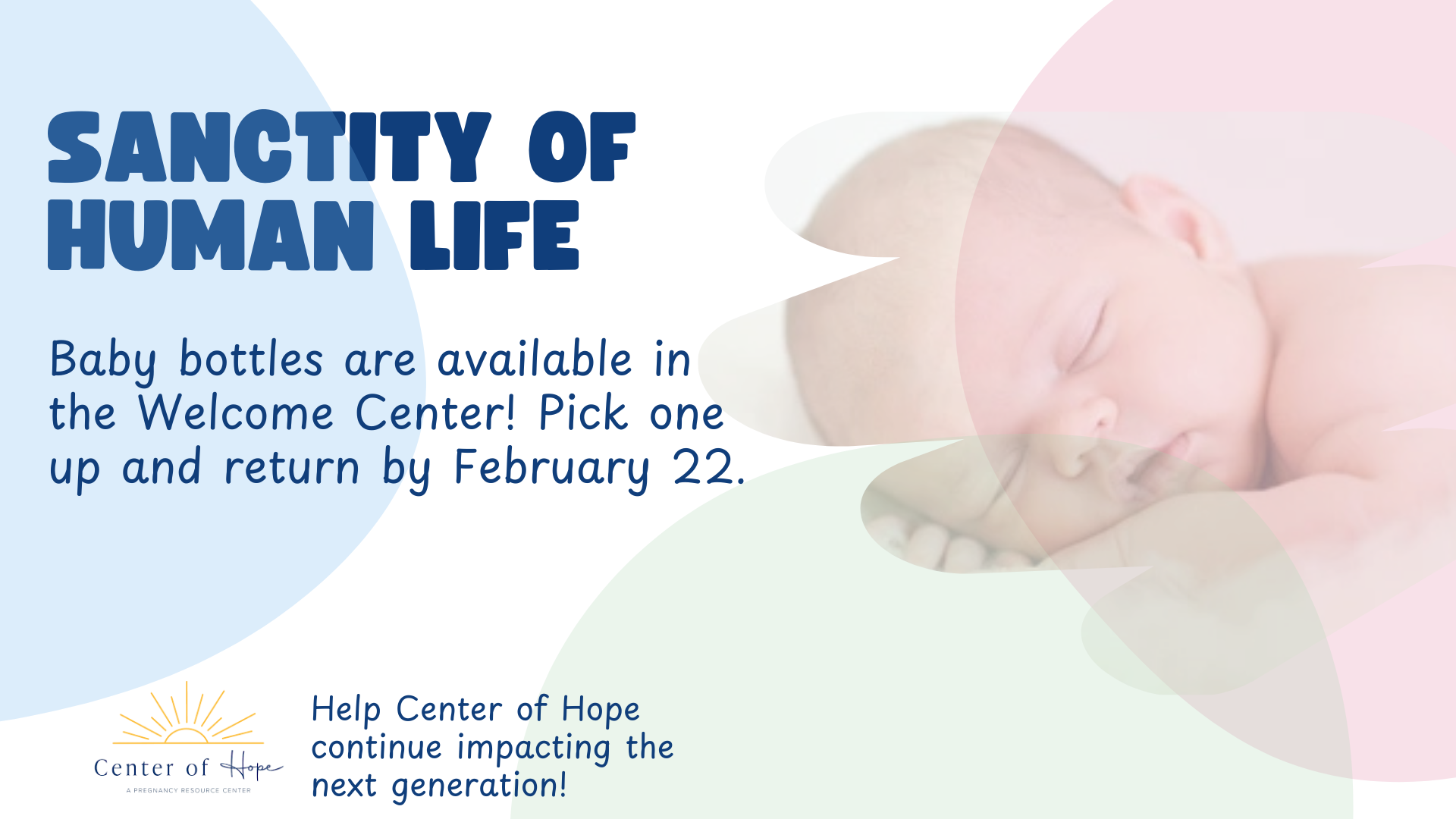 Baby bottles are available in the Welcome Center! Pick up a bottle and fill it with change, bills or a check. Bottles are due on Sunday, February 22. If you pick up a bottle, please bring it back whether you put anything in it or not. The center needs their bottles back.