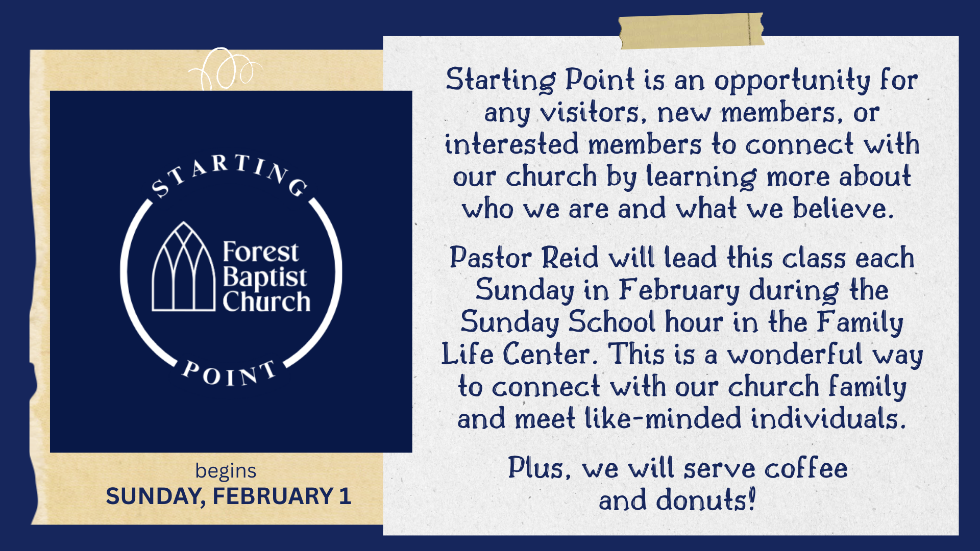 Plus, we will serve coffee and donuts! See you Sunday, February 1 at 9:45 a.m. in the Family Life Center!