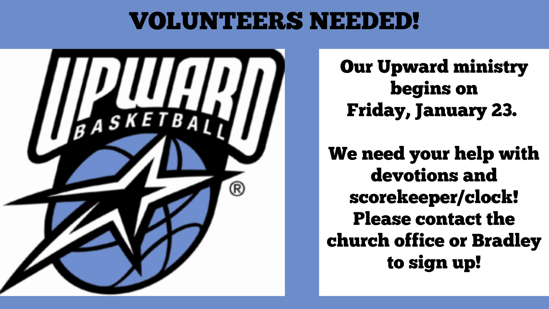 Our Upward ministry begins on Friday, January 23. We need your help with devotions and scorekeeper/clock! Please contact the church office or Bradley to sign up!