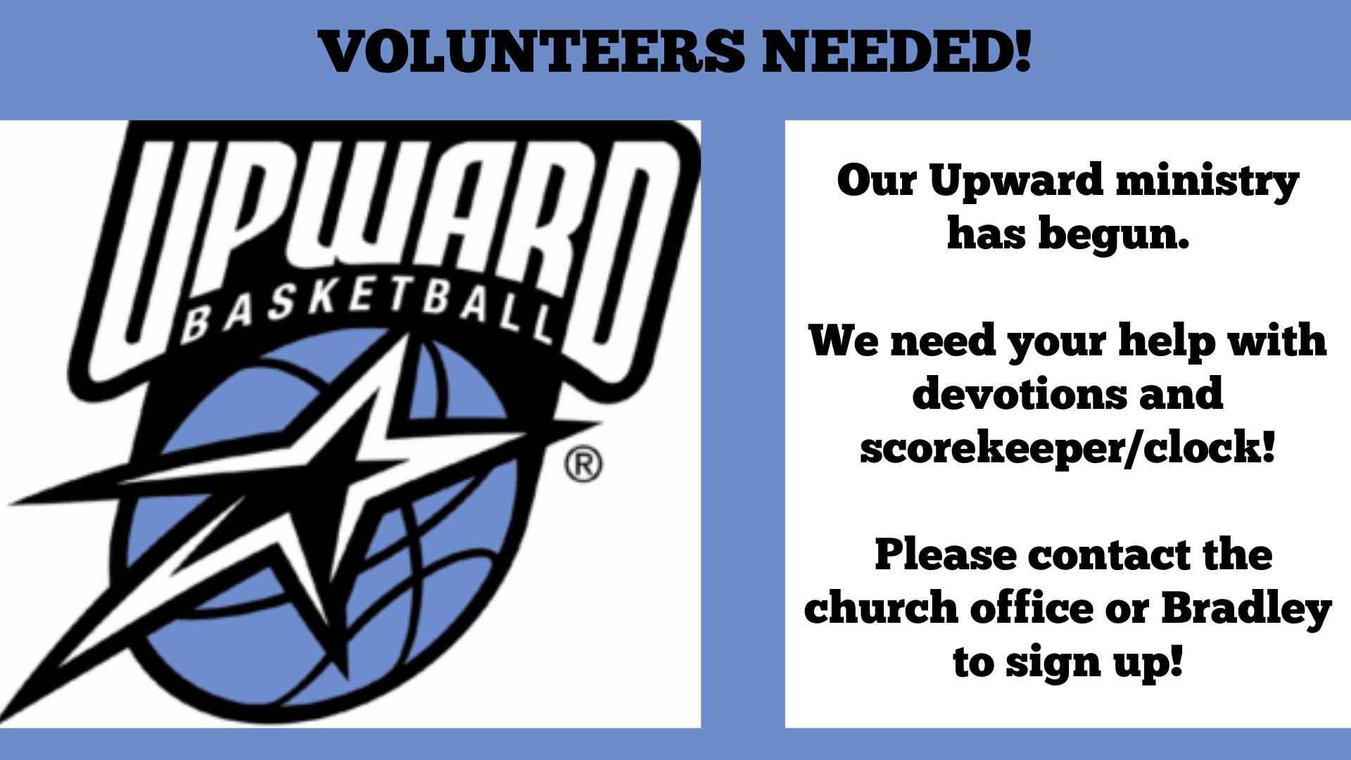 Our Upward ministry has begun. We need your help with devotions and scorekeeper/clock! Please contact the church office or Bradley to sign up!