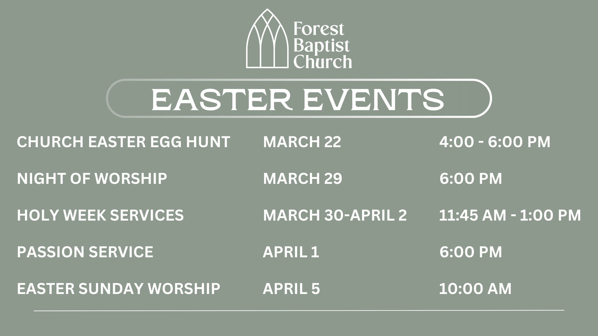 Here’s a list of our upcoming Easter Events! Mark your calendar now so you can be a part of this special season!