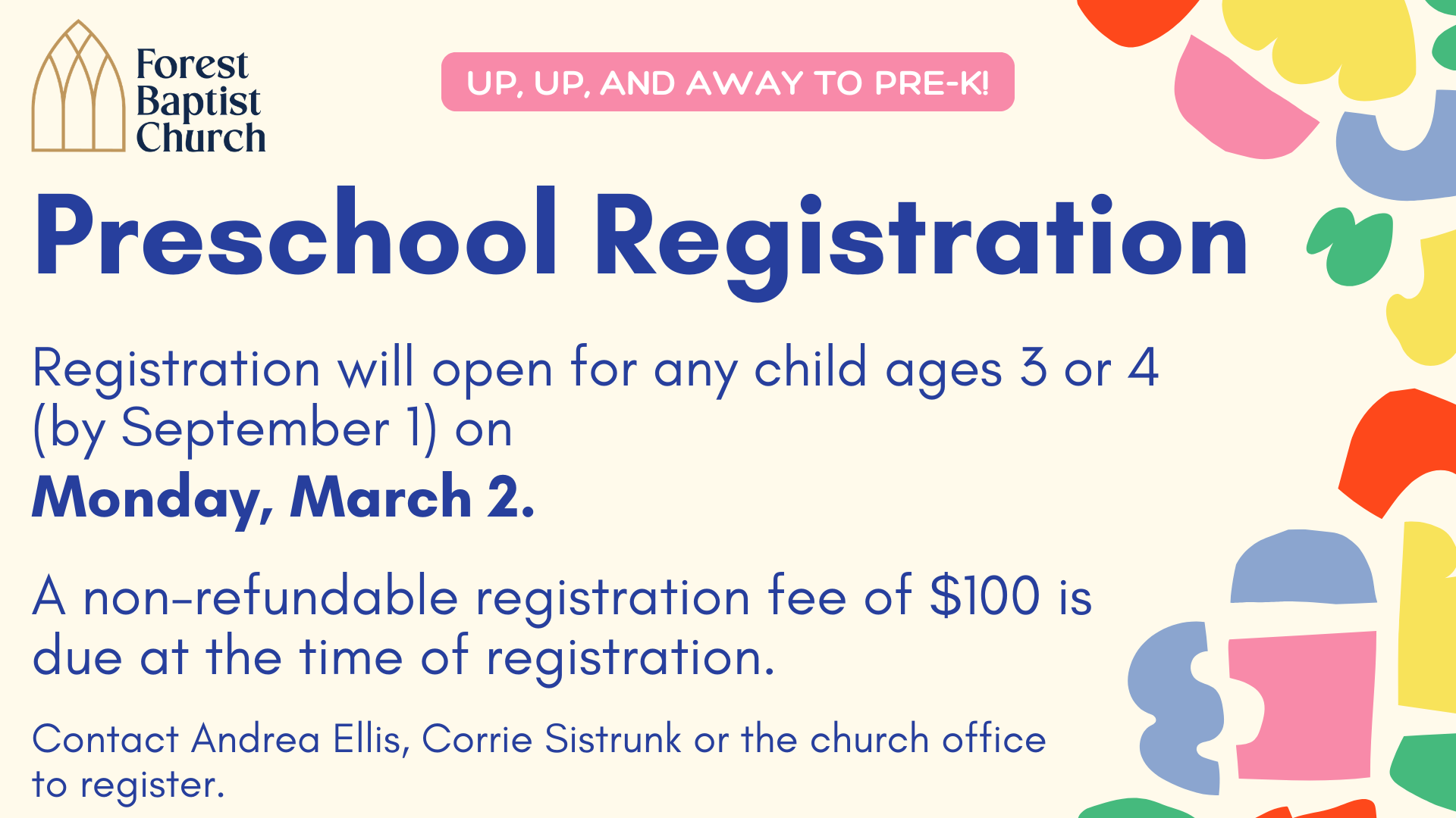 Registration will open on Monday, March 2 for any child that will be 3 or 4 before September 1. A non-refundable registration fee of $100 is due at the time of registration.