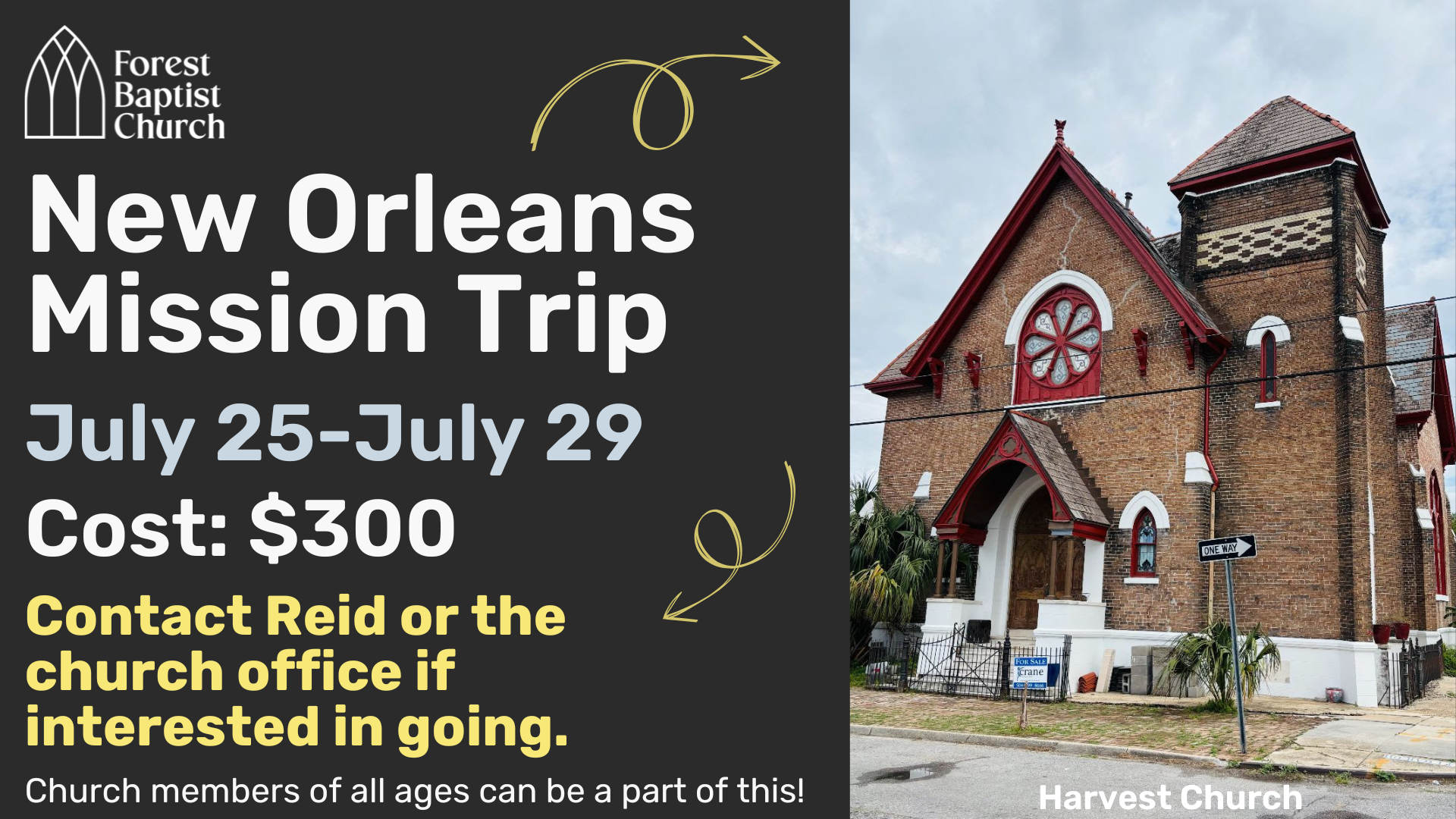 Church members of all ages can be a part of this! Plans are to help Harvest Church in New Orleans connect with people in their community and work on their newly acquired church building. We can take up to 20 people so if you’re interested in joining us, please contact Pastor Reid or the church office. To learn more about Harvest Church, visit their website https://www.harvestchurchnola.com/.