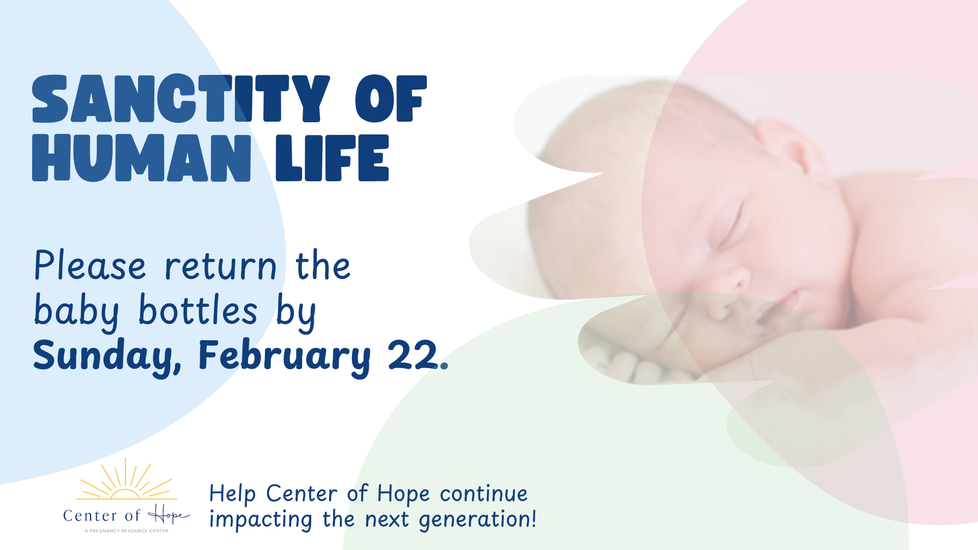 Bottles are due on Sunday, February 22. If you pick up a bottle, please bring it back whether you put anything in it or not. The center needs their bottles back. Thank you for helping Center of Hope to continue impacting the next generation!
